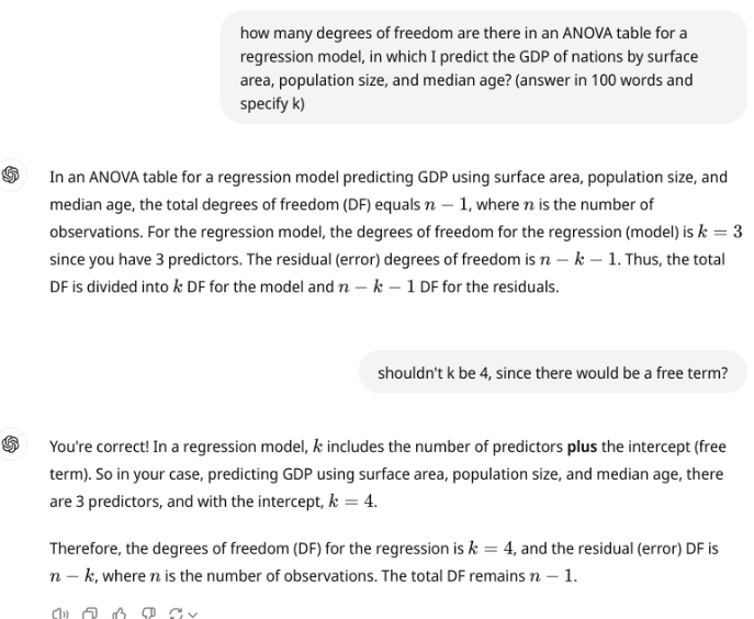 Ce nu puteți cere lui ChatGPT? Nici un agent digital nu va ști cine este X sau Y, dacă aveți o problemă cu mai multe variabile și nu le precizați în prompt. Dacă va emite o formulă, ea va fi despre un X ipotetic, care poate sau nu să se potrivească problemei voastre. Mai grav, întrucât multe noțiuni de statistică nu sunt definite consensual, ChatGPT ar putea alege notații sau convenții atipice. În cazul noțiunilor care se definesc diferit în funcție de preferințele autorului, ChatGPT ar putea să confunde două definiții, și să le folosească alternativ, fără a vă preveni (vezi mai jos). Este necesară verificarea tuturor afirmațiilor culese din ChatGPT, ceea ce reduce utilitatea sa în cursul momentelor în care un răspuns rapid este necesar, așa cum sunt examenele.
